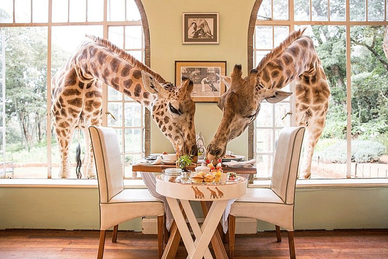 Nhà hàng hươu cao cổ Giraffe Manor ở Kenya thu hút khách du lịch bởi phong cách dân dã gắn kết với thiên nhiên. Đến đây, du khách có thể chia sẻ bữa ăn sáng của mình cho những chú hươu cao cổ rất dạn dĩ, được thỏa sức vuốt ve, và chụp hình với chúng trong khung cảnh thiên nhiên hoang dã.