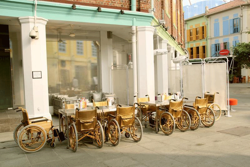 Quán Clinic với những chiếc xe lăn, giường bệnh và ghế nha sĩ
